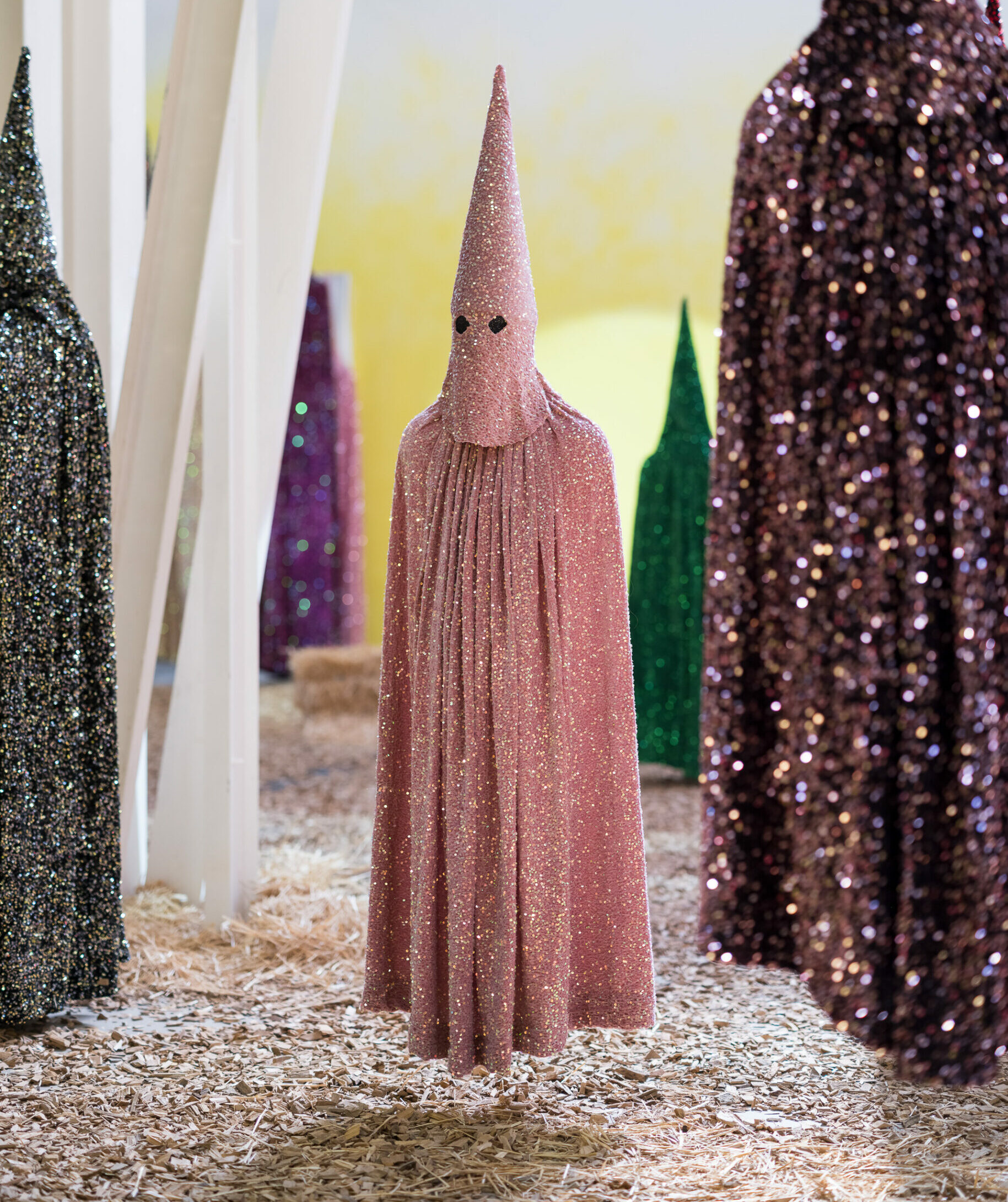 À l’occasion des 40 ans du Confort Moderne à Poitiers, le lieu accueille l’exposition personnelle de Romuald Jandolo sous le commissariat d’Elora Weill-Engerer. Pardon pour la lumière déploie une installation grand format peuplée de figures ambiguës, entre derviches tourneurs, fantômes grotesques et effigies inquiétantes du Ku Klux Klan. L’artiste nomme ces personnages les matassins, témoins ou bourreaux d’un rituel suspendu, puisant dans les sorcières de Francisco de Goya, les violences de la foire coloniale et les origines équestres et guerrières du cirque. Ces mises en scène carnavalesques du pouvoir habillent de paillettes les pantins d’une farce tragique. Et sous les feux de la rampe, c’est la lumière elle-même qui accuse une histoire qui bégaie, qui se rejoue en boucle.
