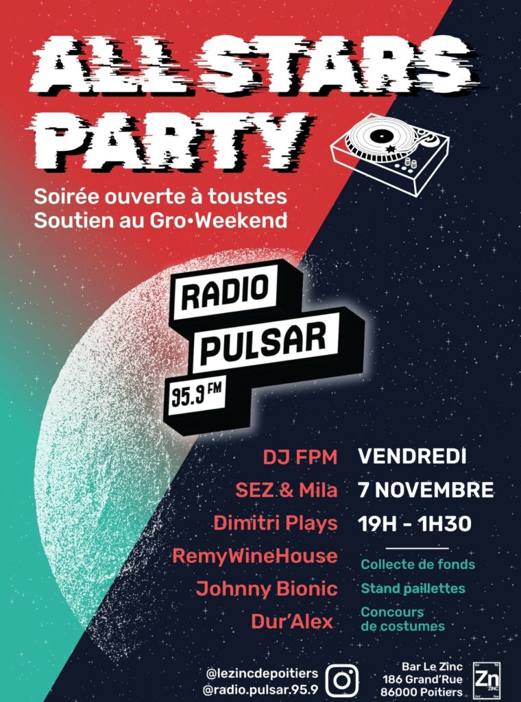 Radio Pulsar fait sa All Stars Party 💫 Rendez-vous le vendredi 7 novembre, de 19h à 1h au bar @lezincdepoitiers pour fêter l’automne non-monotone en mode intergalactique ! 💎 Collecte de fonds pour le Groweekend👽Concours de costumes radio-astro-spatio-extraterrestres✨ Stand de paillettes🎧 DJ sets :– DJ FPM– SEZ et Mila @strictly_hip_hop_95.9 @xvi16sez– Dimitri Plays @dimitri.perrier.5– RemyWineHouse […]