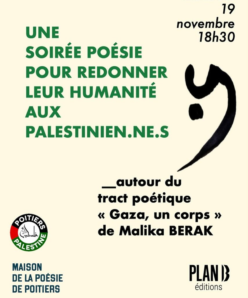 Le Comité Poitiers-Palestine et la Maison de la Poésie de Poitiers s’associent pour vous proposer une soirée en compagnie de Malika BERAK autour de son tract poétique Gaza, un corps (Plan B édition). Rendez-vous à 18h30 au local de la Maison de la Poésie. (198, rue du faubourg du Pont-neuf à Poitiers) La soirée se […]